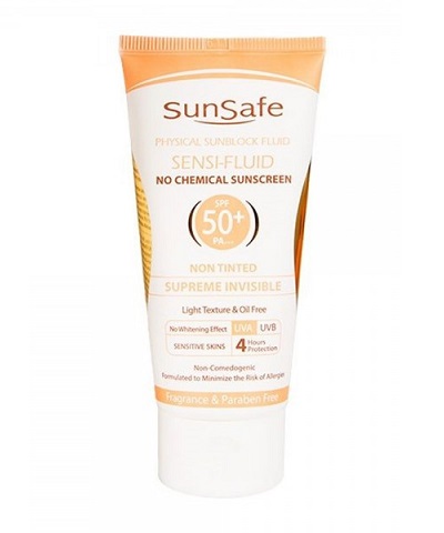 توليد ضد آفتاب سنسي فلوئيد +SPF50 سان سيف، عصر جديدي در حفاظت پوست در برابر درماتولوژي به شمار ميرود. اين ضد آفتاب فلوئيد حفاظت وسيعي در برابر اشعههاي UVA1 UVA2 و UVB ايجاد ميکند که به واسطه ميکروتيتانيوم دي اکسيد، يک سپر دفاعي براي پيشگيري آسيب اشعههاي خورشيد ايجاد ميکند. ضد آفتاب سنسي فلوئيد، حفاظت وسيعي در برابر اشعههاي UVA و UVB ايجاد مينمايد. کمپلکس ويتامين E+B3 و چاي سبز، از آسيب DNA پوست در اثر خورشيد جلوگيري ميکند. اين محصول بر پايه سيستم نوين Water Gel فرموله شده است و در نتيجه فاقد امولسيفاير است.
