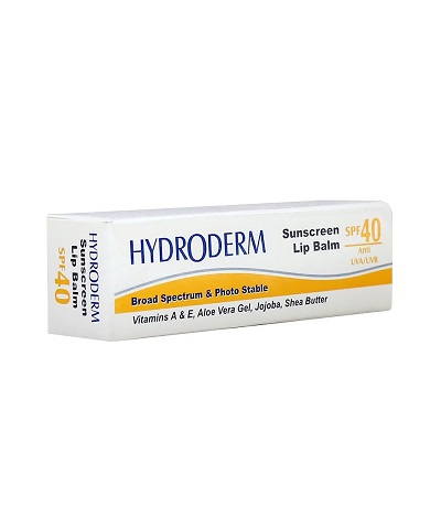 بالم لب حاوي ضد آفتاب آقايان SPF40 هيدرودرم، سرشار از ويتامين A و E ميباشد و علاوه بر خاصيت مرطوب کنندگي داراي خواص التيام بخشي و ترميم کنندگي نيز مي باشد. ژل آلوئهورا موجود در فرمولاسيون ضد آفتاب لب، در ترميم، بازسازي و التيام بخشيدن پوست آسيب ديده در اثر مواجه با تابش نور آفتاب نقش اساسي ايفا مينمايد. روغن جوجوبا نيز علاوه بر اثرات مرطوب کنندگي و نرم کنندگي در بهبود و افزايش الاستيسيته و انعطاف پذيري پوست نقش بسزايي دارد.