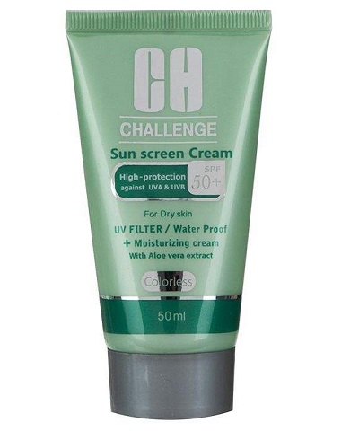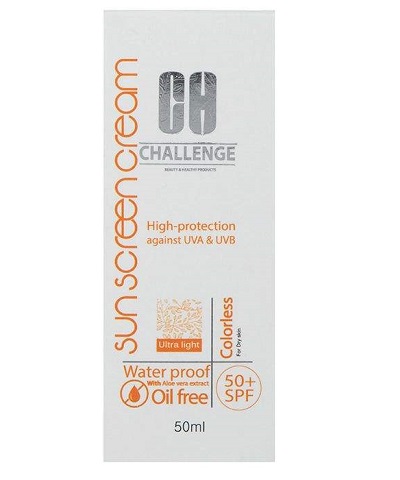 ضد آفتاب مخصوص پوست نرمال و خشک (بي رنگ) چلنج با فرمولاسيون بسيار سبک و با دارا بودن فيلترهاي پيشرفته UVA وUVB حداکثر حفاظت از پوست را در برابر اشعه هاي مضر خورشيد به عمل مي آورد. اين ضد آفتاب حاوي عصاره آلوئه ورا جهت آبرساني و حفظ هيدراتاسيون پوست بوده و ضد تعريق است. بدليل وجود آلانتوئين تحريک کننده و احيا کننده سلولها و باعث بهتر درمان شدن قرمزي پوست مي شود. اين کرم جزء محصولات آرايشي نبوده و يک محصول توصيه شده توسط درماتولوژيست ها مي باشد. از پوست در برابر راديکالهاي آزاد که موجب پيري پوست مي شود محافظت مي نمايد. ضد آفتاب بي رنگ چلنج بدون ايجاد سفيدي روي پوست، ماندگاري بالا و مناسبي داشته بطوريکه ماندگاري اثر آن بيش از دو برابر يک ضد آفتاب عادي است. روش مصرف: 30دقيقه قبل از در معرض آفتاب قرار گرفتن، ضد آفتاب را روي تمامي نقاط بدن بخصوص صورت، گردن، گوشها و پشت دست بماليد تا کاملا جذب شود، براي بهترين نتيجه اين عمل را هر 4 ساعت يکبار تکرار نماييد.