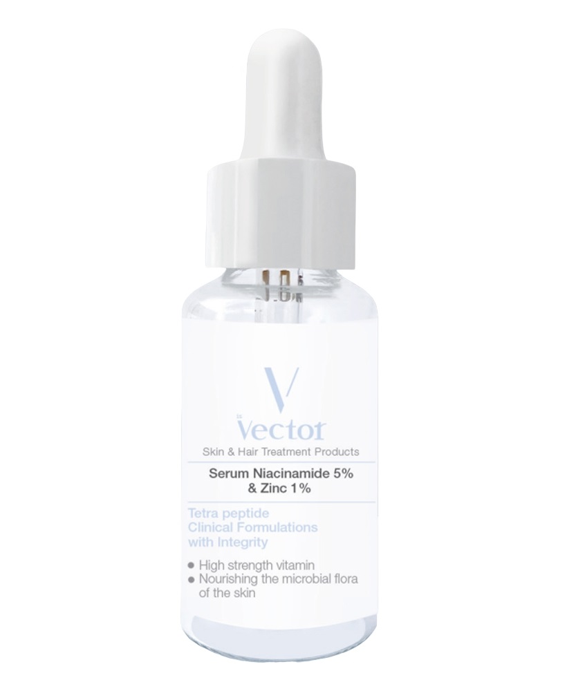 سرم نياسيناميد 5% و زينک 1% وکتور، يک ترکيب بسيار مؤثر در مراقبت از پوست است که به طور گسترده اي براي درمان مشکلات پوستي مورد استفاده قرار مي گيرد. اين محصول به دليل دارا بودن نياسين آميد و زينک چنان قدرتمند عمل مي کند که ميتواند در زمان کوتاهي چربي پوست را تنظيم نموده، التهاب پوست را کاهش دهد و در نتيجه باعث درمان جوش و آکنه پوستي شود.