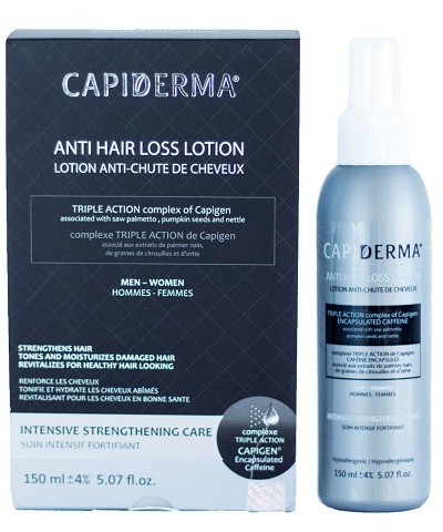 لوسيون ضد ريزش و تقويت کننده کپيدرما به همراه فرمول منحصر به فرد خود درماني قطعي براي ريزش موهاي آقايان و رشد مجدد موهاي از بين رفته و درماني واقعي براي ريزش موهاي خانم ها و يا ترميم موهاي آسيب ديده که در اثر بارداري، رژيم هاي لاغري، يائسگي ، تغييرات هورموني و يا استفاده از مواد شيميايي که به وجود مي آيد، مي باشد.لوسيون مو کپيدرما به همراه ترکيبات سه گانه Capigen عصاره هاي نخل اره اي ، دانه کدو تنبل و عصاره گزنه که غني از آهن و سيليس است به بازسازي مجدد مو کمک کرده و همچنين با مقاوم نمودن ريشه مو که در اثر وجود گياهان دارويي شناخته شده در لوسيون کپيدرما است بر سرعت رشد مو نيز تاثير بسزايي دارد.